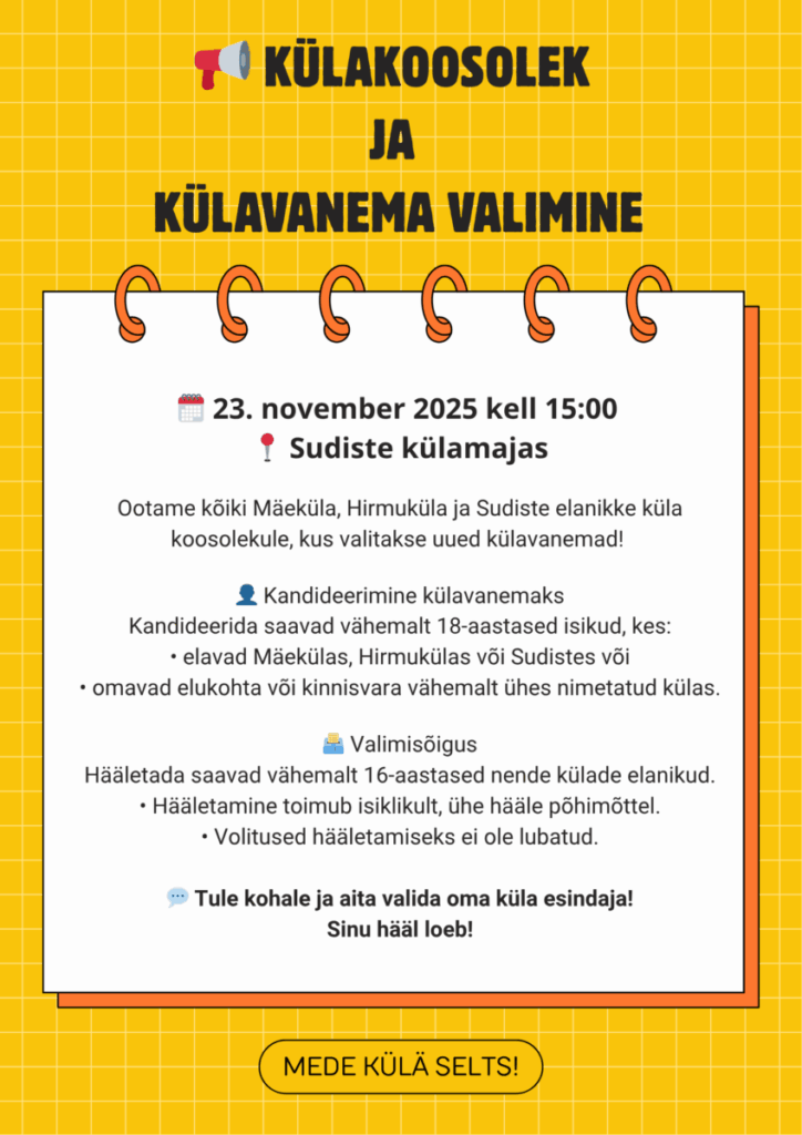 Külavanema valimine toimub Sudiste külamajas 23. novembril algusega kell 15.00