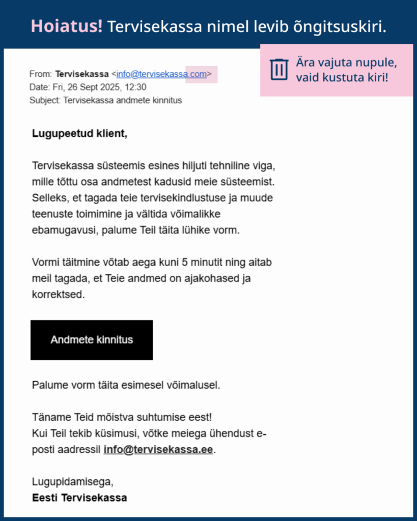 Viimaste päevade jooksul levib Tervisekassa nimel õngitsuskiri, kus väidetavalt on Tervisekassa süsteemis esinenud tehniline viga koos andmete kadumisega. See ei vasta tõele!